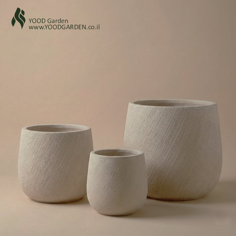 כדים מעוצבים בקווים עגולים ומעט מחודדים, עם טקסטורה רכה המדמה ליטוש עדין של אבן טבעית. הגוון הבהיר והמרקם החמים מעניקים נוכחות שקטה ומוארת, שמתאימה לכל חלל. פריט עיצובי נקי, מאוזן ומינימליסטי שמוסיף מגע של אלגנטיות טבעית לבית.